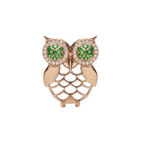 Multifunctional pins with a back locking system. Can be worn on any clothes or hat. The piece is made of 18ct pink gold in the shape of an owl. Covered with natural diamonds and Tsavorites.